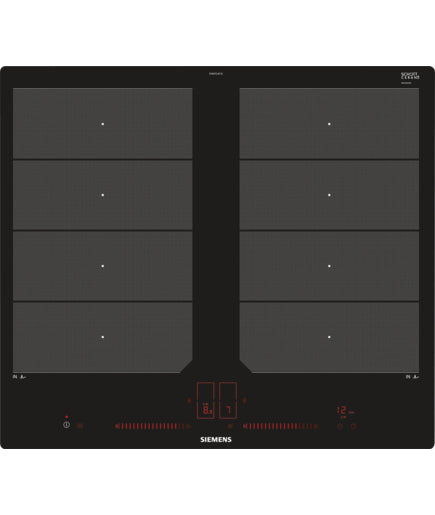 Siemens EX601LXC1E. Produktfarve: Sort, Placering af apparat: Indbygget, Komfurtype: Zone induktionskogeplade. Simre kogeplade / madlavningsområde: 2200 W, Almindelige kogeplade / madlavningsområde: 2200 W. Kontroltype: Berøring, Kontrolposition: Top forside. Tilsluttet belastning (elektrisk): 7400 W, Vekselstrømsindgangsspænding: 220-240 V, Vekselstrømsindgangsfrekvens: 50 - 60 Hz. Bredde: 572 mm, Dybde: 512 mm, Højde: 56 mm