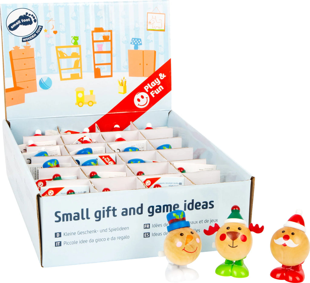 Drej og træk den lille knap op, og julemand, snemand og rensdyr hopper glade afsted.