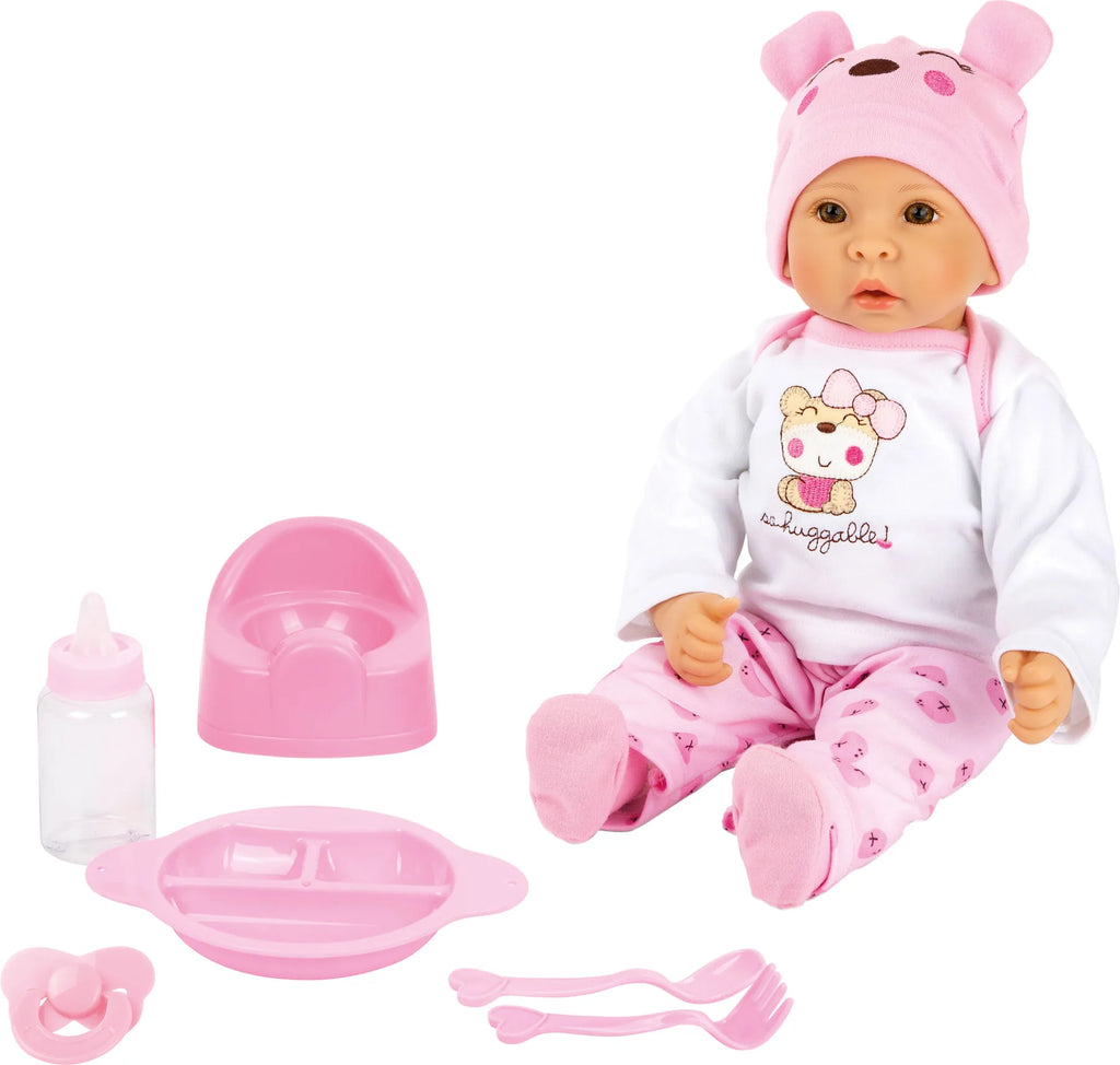 Dukken har en flot dragt i hvide og rosa farver og matchende hue med ører.