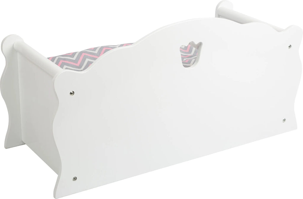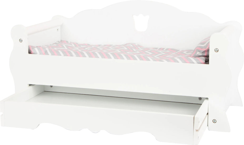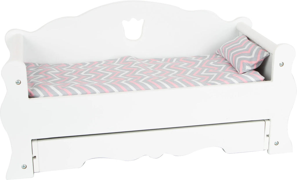Hvidmalet dukkeseng med sengetøj og udtræksskuffe, der kan bruges som en ekstra sengeplads til en dukke.