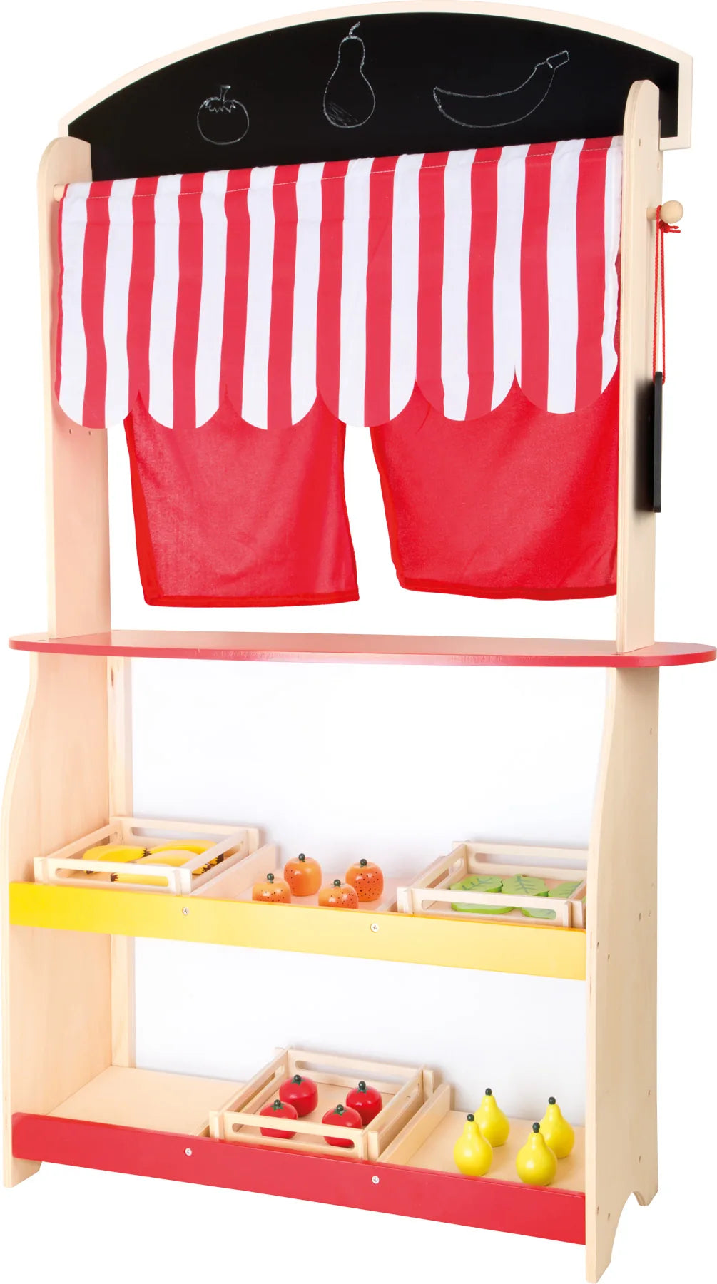 På den ende side en butik med markise og tre frugt og grøntsager kasser.