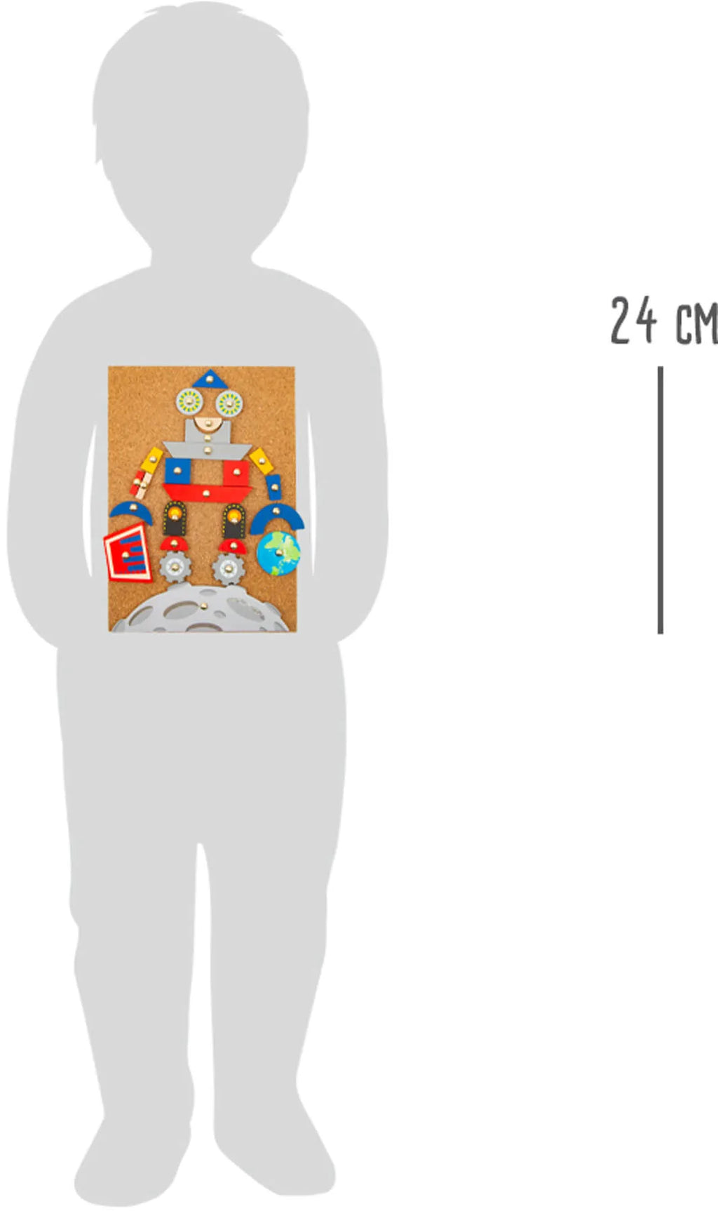 Et korkbræt, en træhammer, små søm, farverige træstykker og figurer til at skabe et individuelt billede. Desuden 4 billeder med ideer til en start. I alt 160 dele