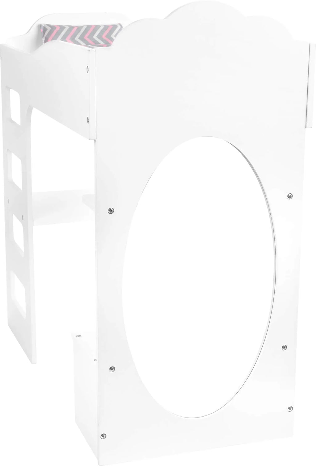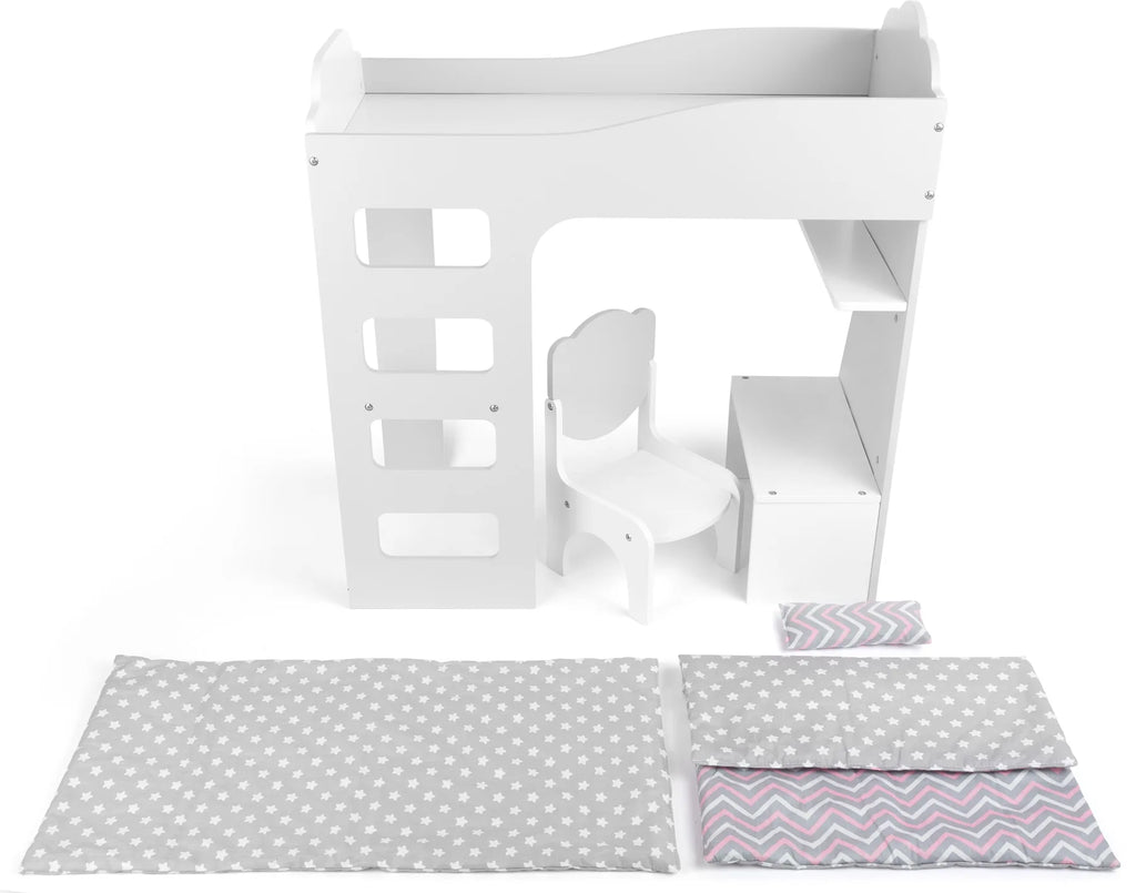 Hvid højseng til hjemmets dukker med spejl, sengetøj, trappe, skrivebord og stol
