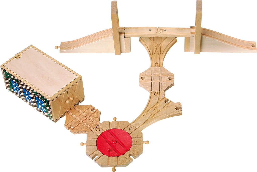 Udstyr til togbane bestående af en remise med aftagelig tag, en jernbanebro, en rundkørsel og fire kryds spor.