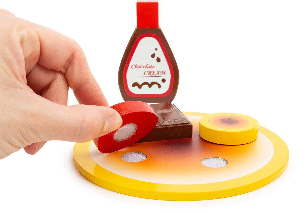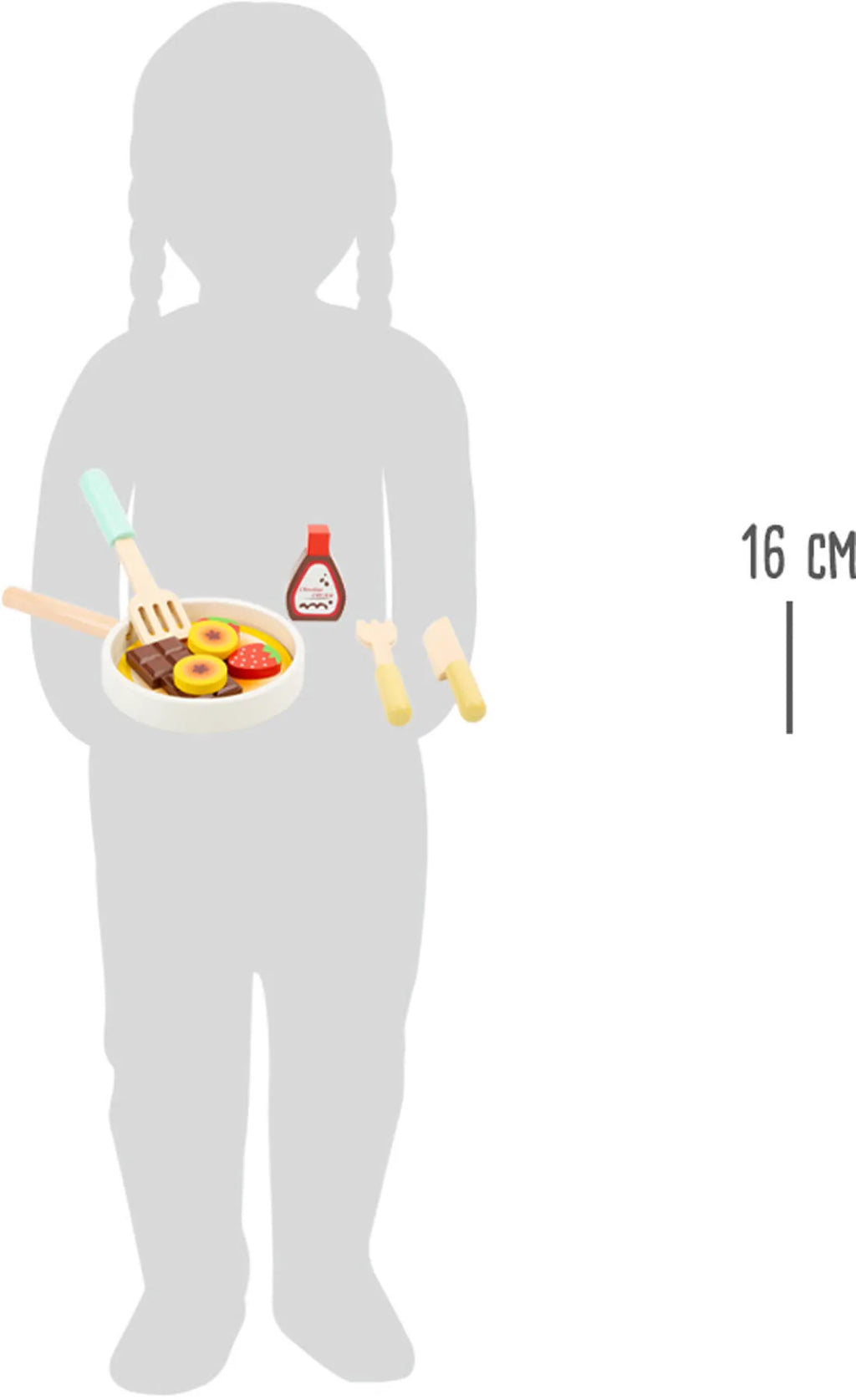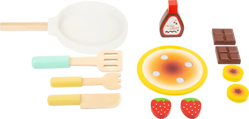 Sættet har bestik, pande, pandekage, bananer, chokolade, jordbær og chokoladesauce, i alt 12 dele.