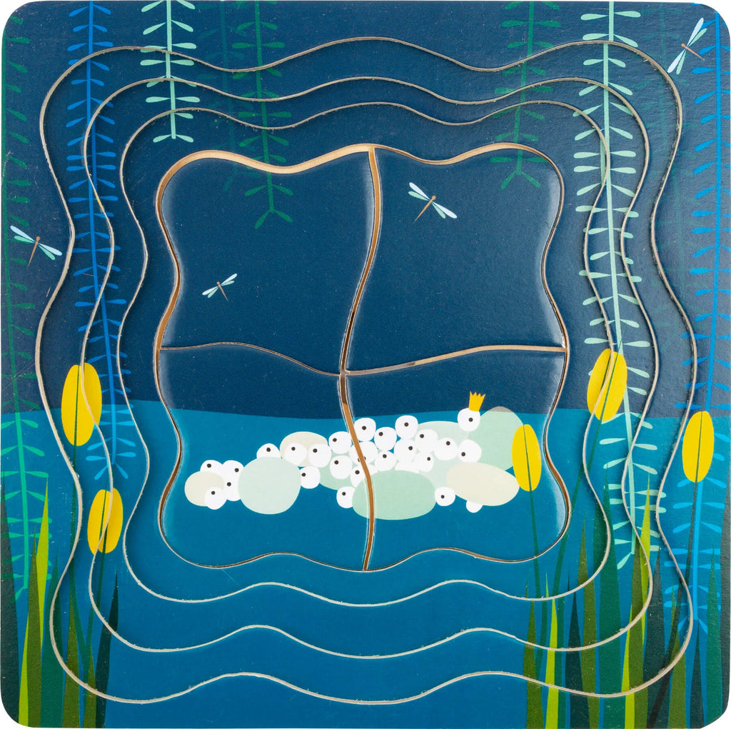 Et kærligt designet puslespil med brikker/billeder der viser, hvordan hvordan et frøæg bliver til en haletudse for til sidst at blive til en stor og flot frøkonge.