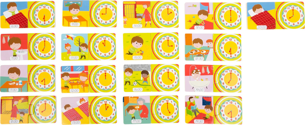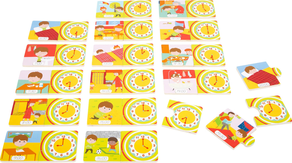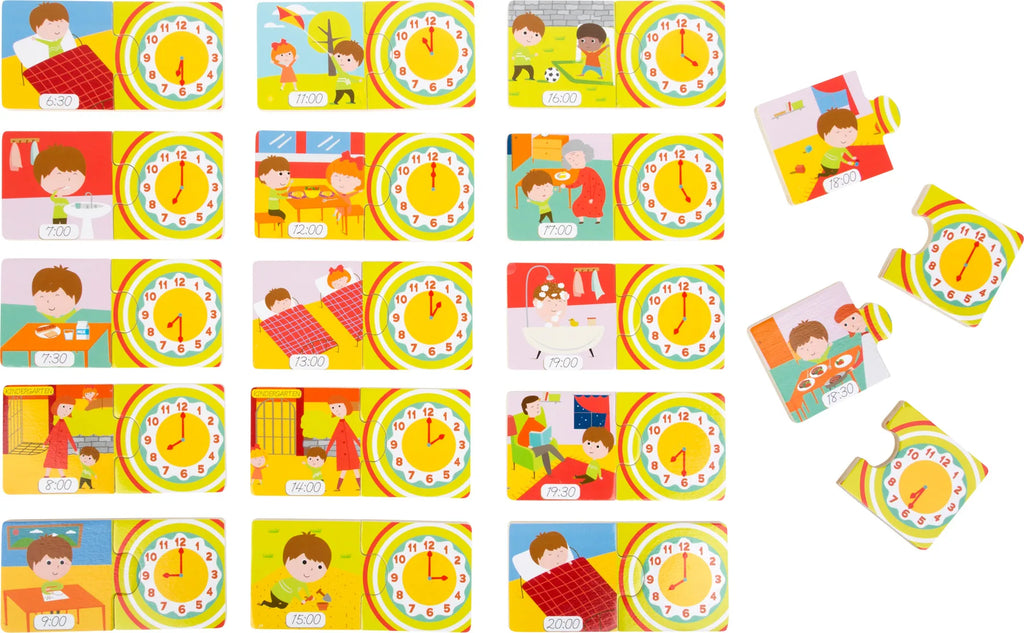 Hjælp barnet til at få forståelse for tid ved hjælp af billeder af daglige rutiner. Puslebrikkerne skal altid sættes sammen to og to.