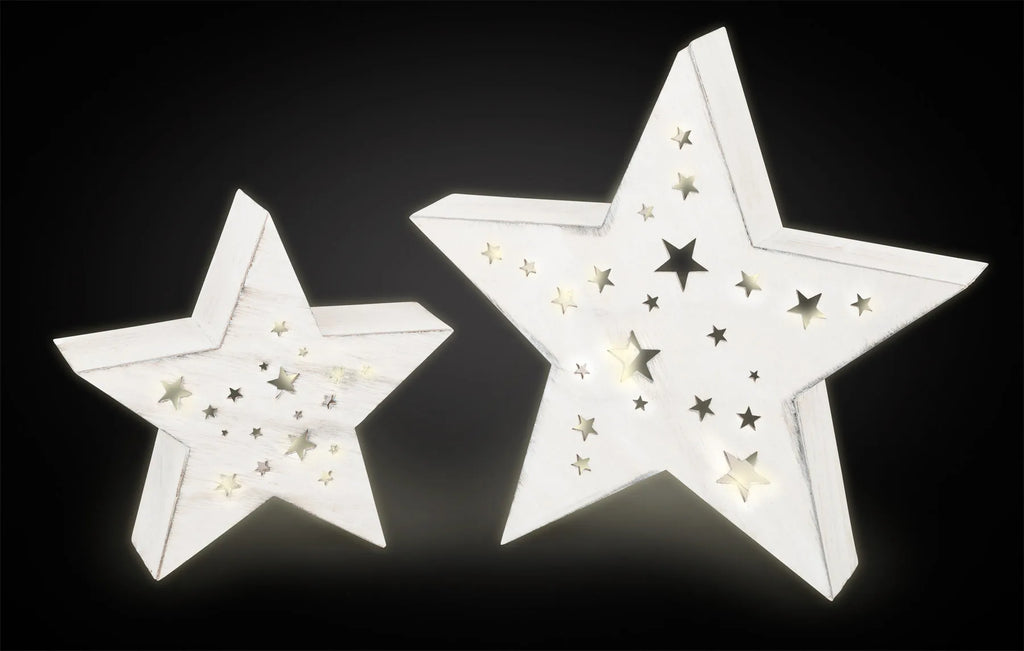 To rustikke stjerner i to størrelser der bruger LED-belys.