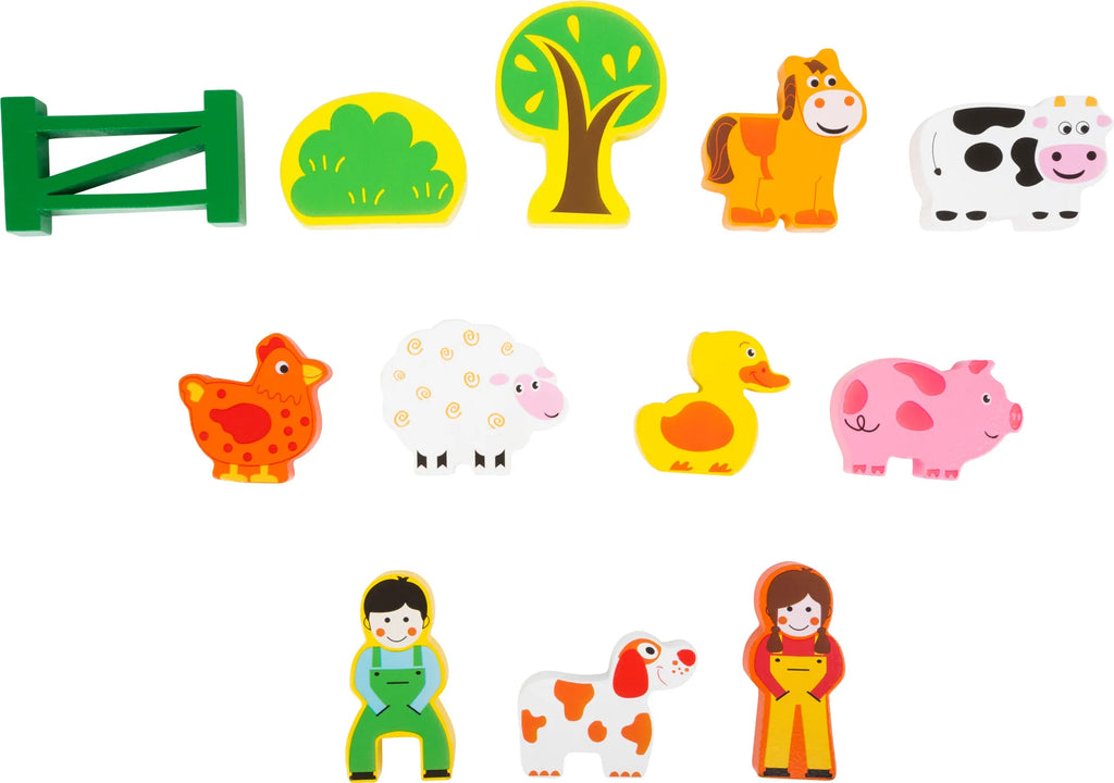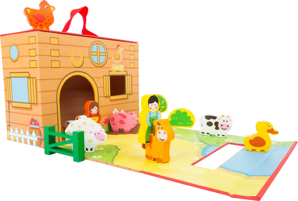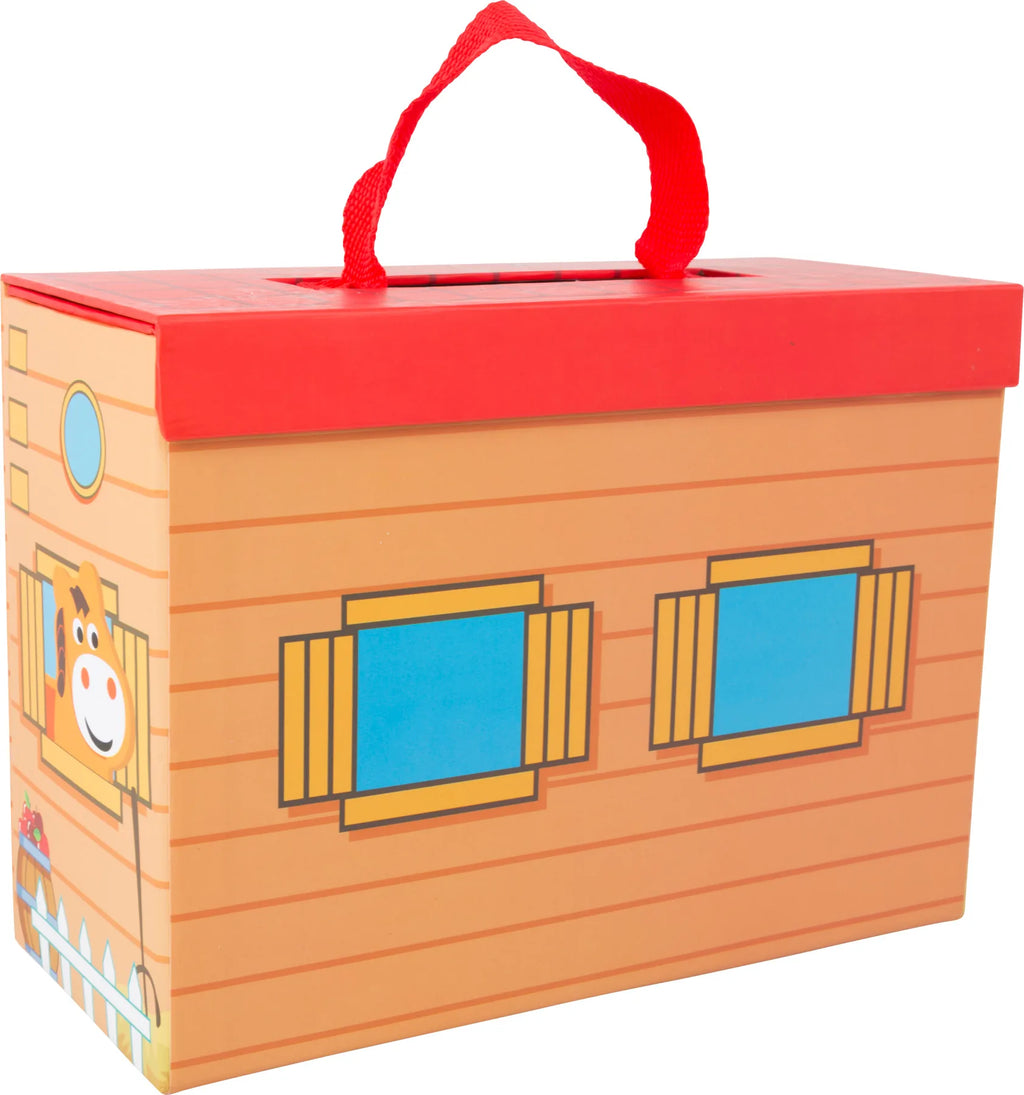 Papkasse der når den åbnes, afsløres en hel bondegård med dyr og marker.