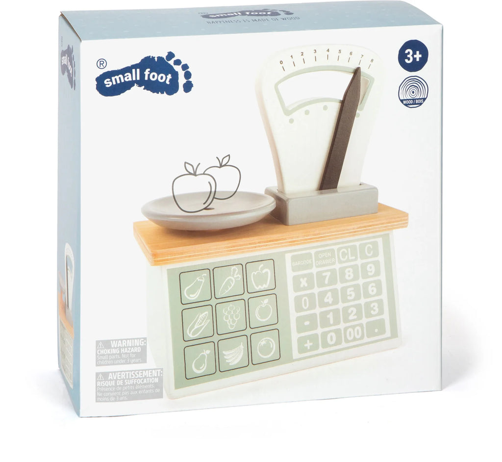 Læg frugten på vægten med fjeder under, tryk på det malede tastatur under vægten og se hvor meget det vejer på skalaen til højre.