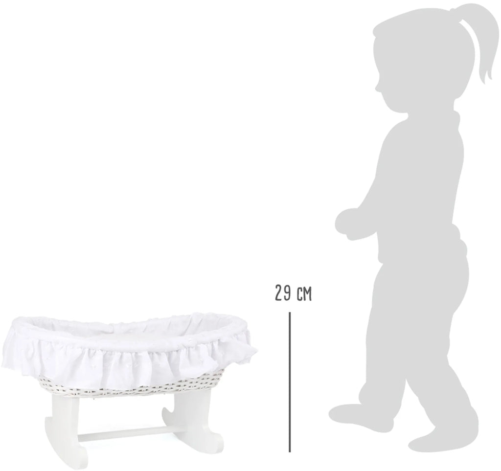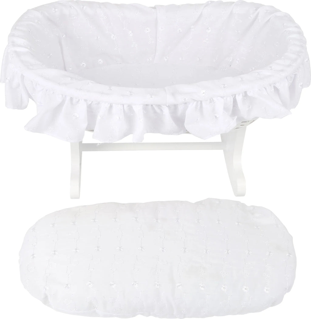 Skøn hvidmalet vugge i flet og pyntet med et smukt filigran tekstil og flæser.