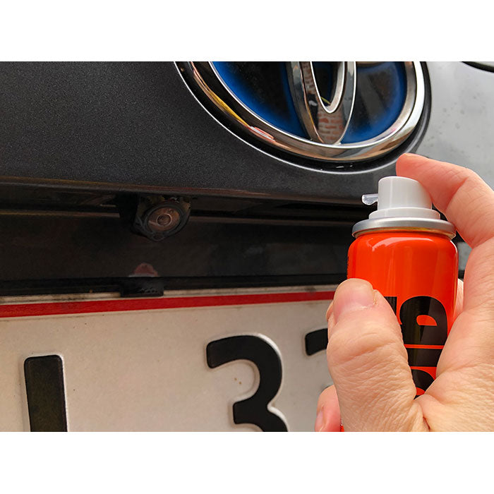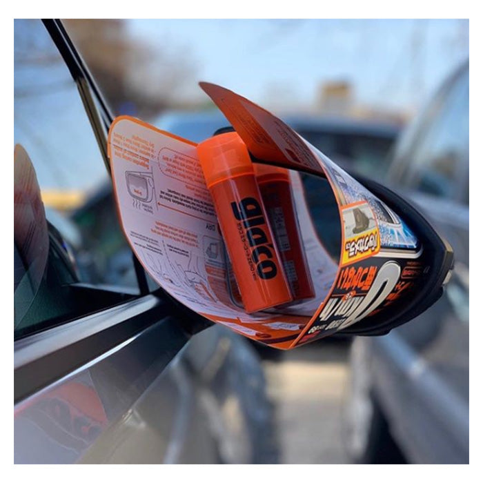 For at opnå det bedste resultat, skal du huske at bibeholde papbagsiden fra æsken. Bøj den i en halvcirkelform og placér den mellem spejlet og huset for nem påføring uden risiko for at sprøjte på andre dele af bilen.