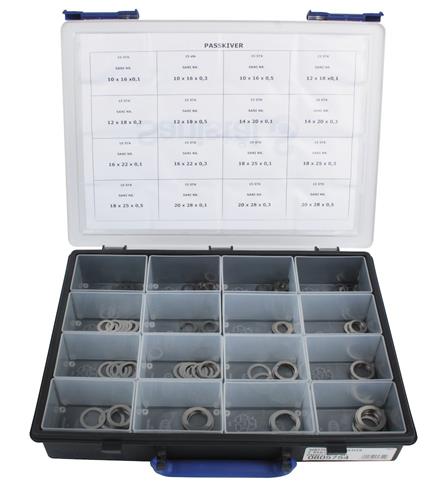 Sortimentskasse m/passkiver 10-20 mm. Sættet indholder: 15 stk. 10x16x0,1, 15 stk. 10x16x0,3, 15 stk. 10x16x0,5, 15 stk. 12x18x0,1, 15 stk. 12x18x0,3, 15 stk. 12x18x0,5 15 stk. 14x20x0,1, 15 stk. 14x20x0,3, 15 stk. 16x22x0,1 15 stk. 16x22x0,3, 15 stk. 18x25x0,1, 15 stk. 18x25x0,3 10 stk. 18x25x0,5, 10 stk. 20x28x0,1, 10 stk. 20x28x0,3 10 stk. 20x28x0,5