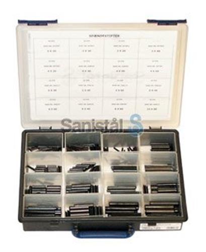 Sortimentskasse med spændstifter DIN 1481/ISO 8752 fra 2-10mm. Sættet indeholder: 50 stk 2x20 mm, 50 stk 2x30 mm, 50 stk 3x20 mm, 50 stk 3x40 mm, 25 stk 4x20 mm, 25 stk 4x30mm, 25 stk 4x50 mm, 25 stk 4x60mm, 20 stk 5x30 mm, 20 stk 5x40 mm, 20 stk 5x60 mm, 20 stk 6x40 mm, 20 stk 6x60 mm, 10 stk 8x40 mm, 10 stk 8x60 mm, 10 stk 10x60 mm