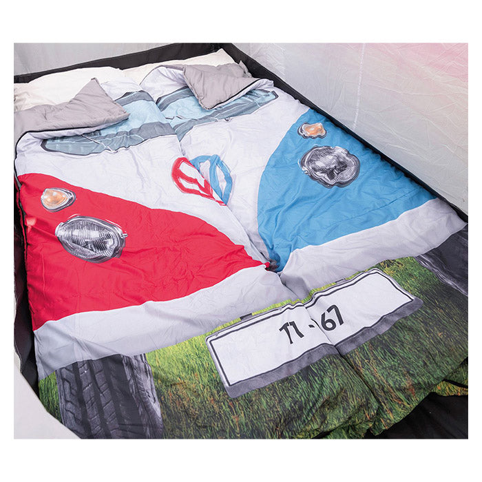 Oplev den perfekte sovepose til din næste campingtur eller festival med vores Sovepose VW T1 bus i rød. Denne enkle sovepose er designet med et unikt VW T1 motiv, der tilføjer et sjovt og nostalgisk præg til din udendørs oplevelse.