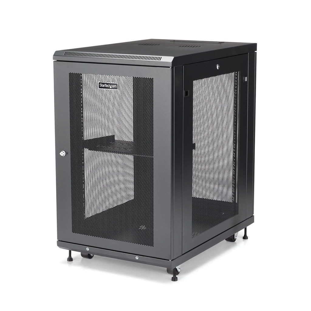 StarTech.com RK1833BKM. Type: Fritstående reol, Rackkapacitet: 18U, Maksimal vægtkapacitet: 450 kg, Nøglelås, Forbedret kabelstyring, Styrehjul. Vægt: 59 kg. Produktfarve: Sort