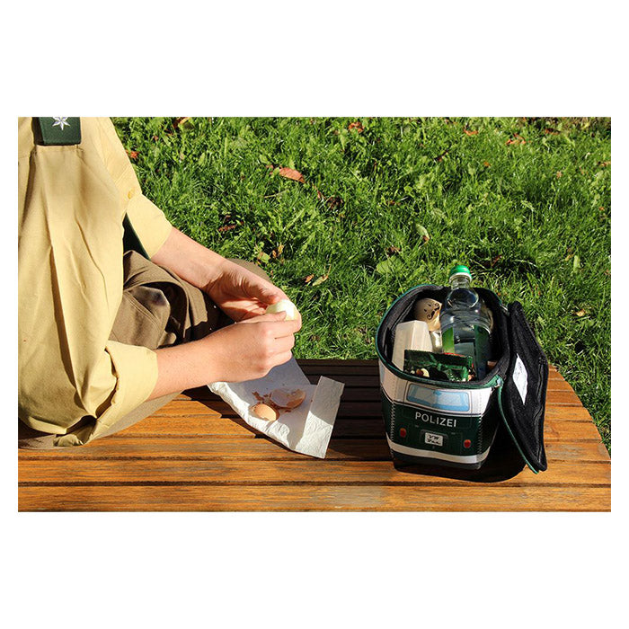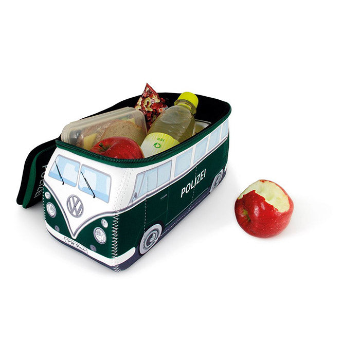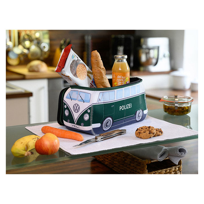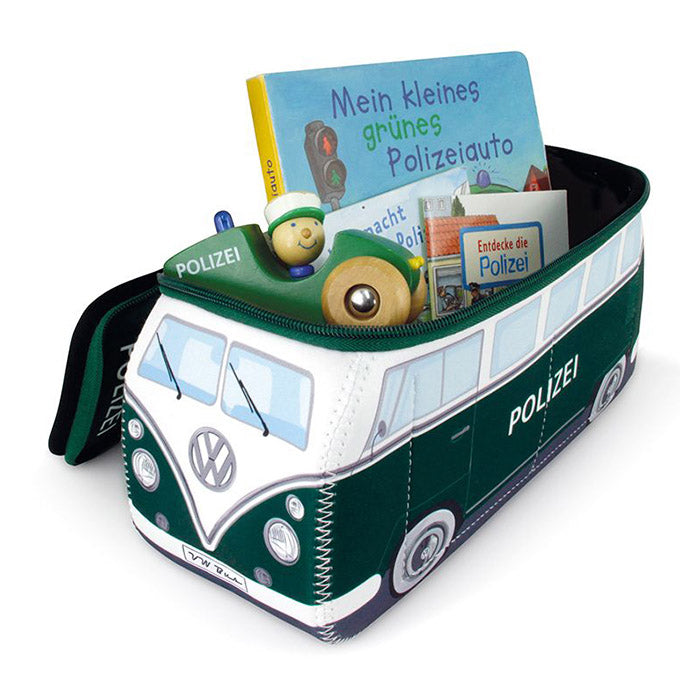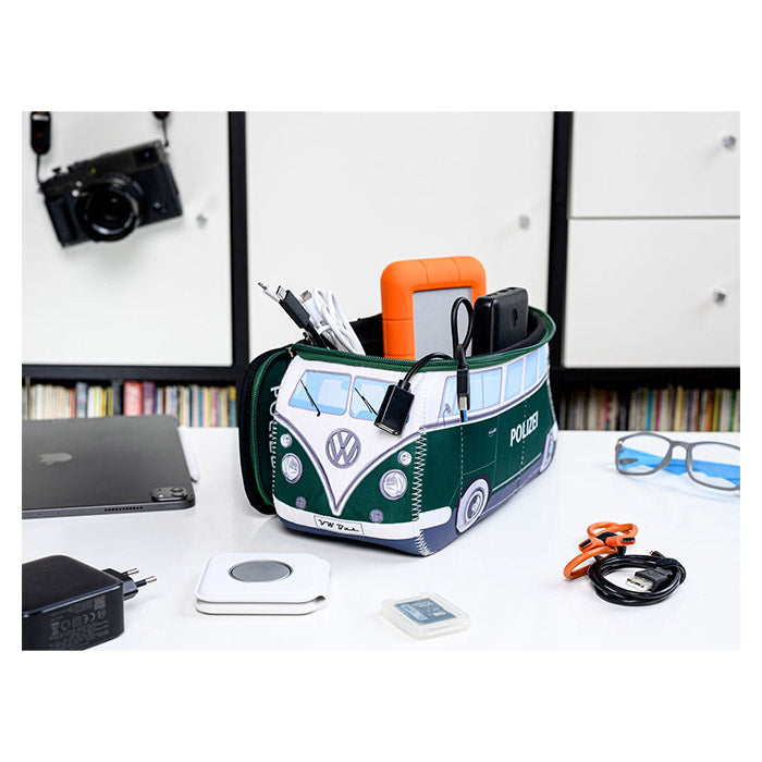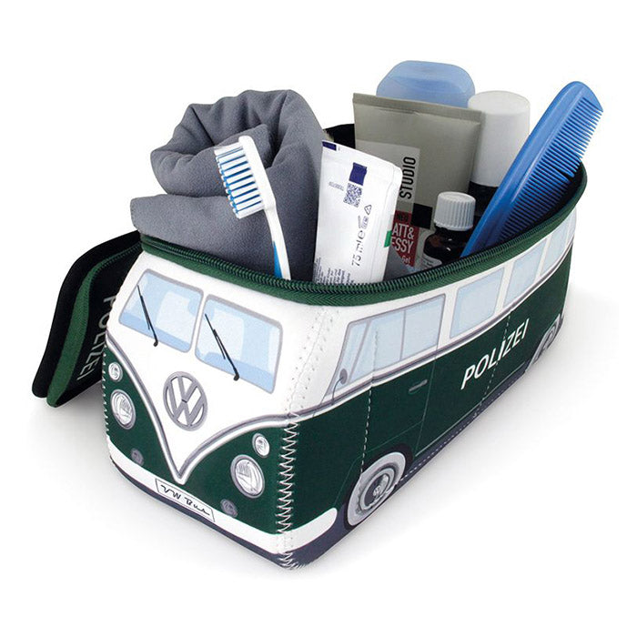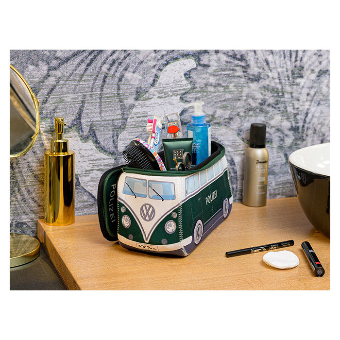 Oplev den unikke VW T1 politibil toilettaske, der kombinerer stil og funktionalitet. Denne kosmetiktaske er designet i en flot mørkegrøn farve og lavet af blød neopren, hvilket gør den både holdbar og vandafvisende.