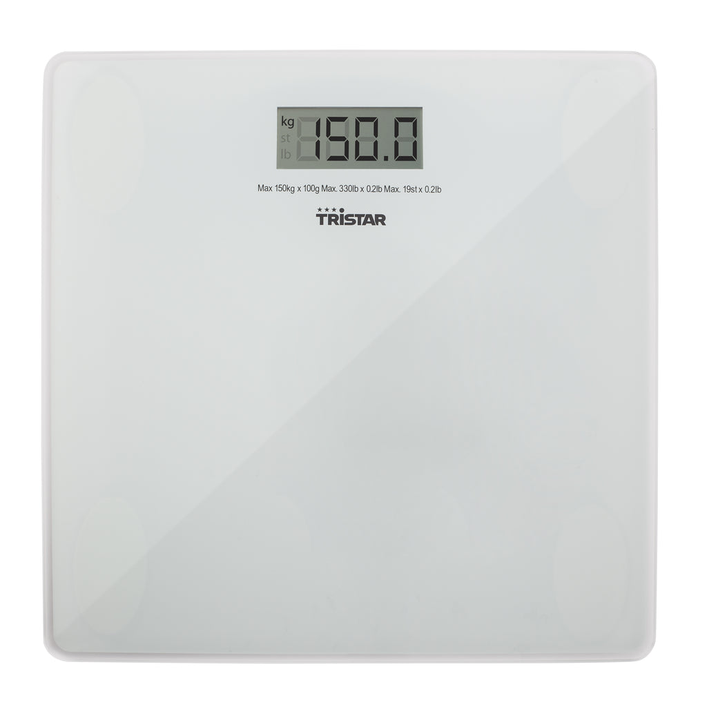 Tristar WG-2419. Type: Elektronisk personlig vægt, Maksimal vægtkapacitet: 150 kg, Nøjagtighed: 100 g. Skærm: LCD. Batteritype: CR2032, Batteriteknologi: Lithium. Bredde: 300 mm, Dybde: 300 mm, Højde: 45 mm. Antal pr. pakke: 1 stk, Pakkebredde: 318 mm, Pakkedybde: 318 mm